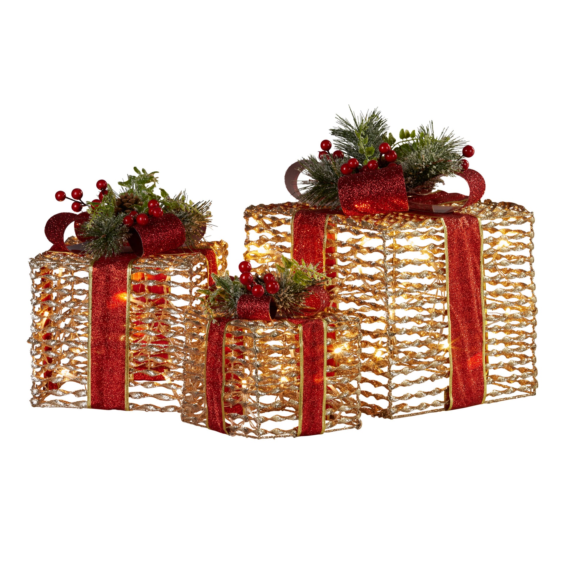 This set looks stunning under a tree or on a table display. They have separate battery boxes so can be split up or positioned together. With foliage and holly to the top, a sparkling textured finish and 35 warm white lights they are sure to brighten up any Christmas.