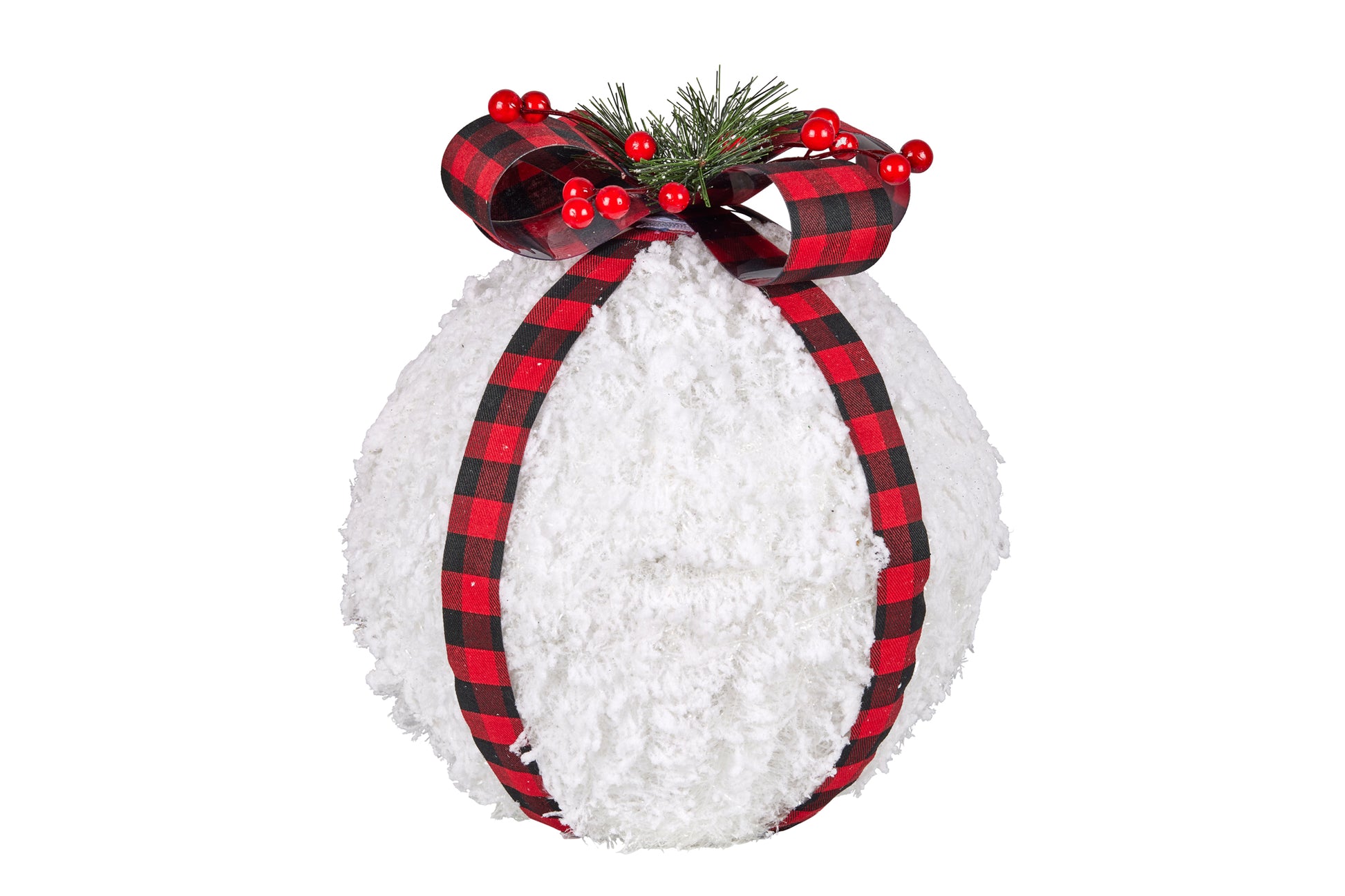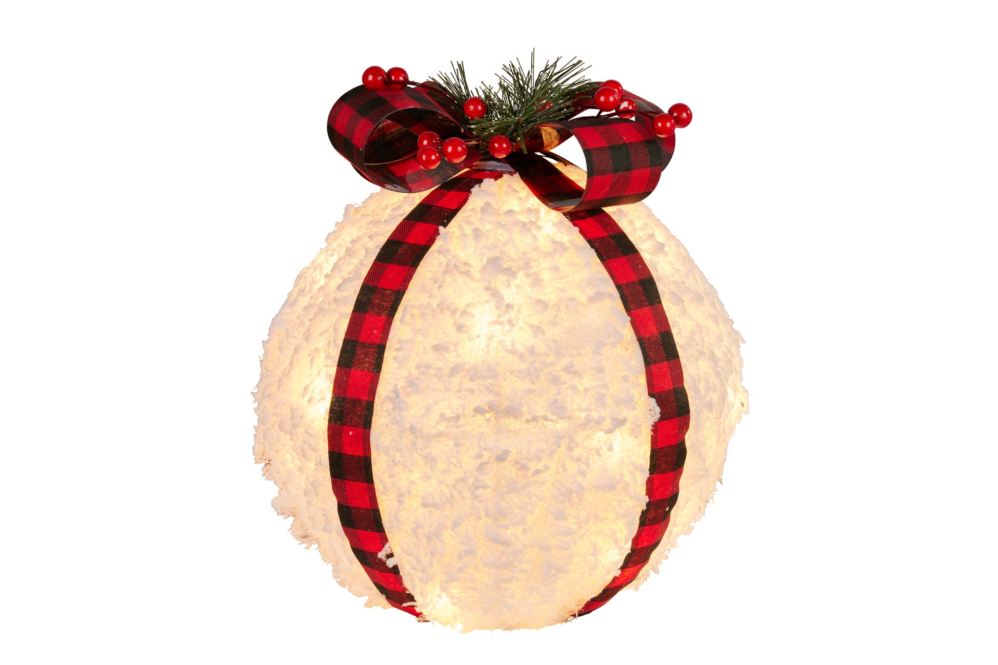 With a snowy finish, tartan bow and warm white lights this 25cm display ball will dazzle in any display. Perfect on a table top or under a tree