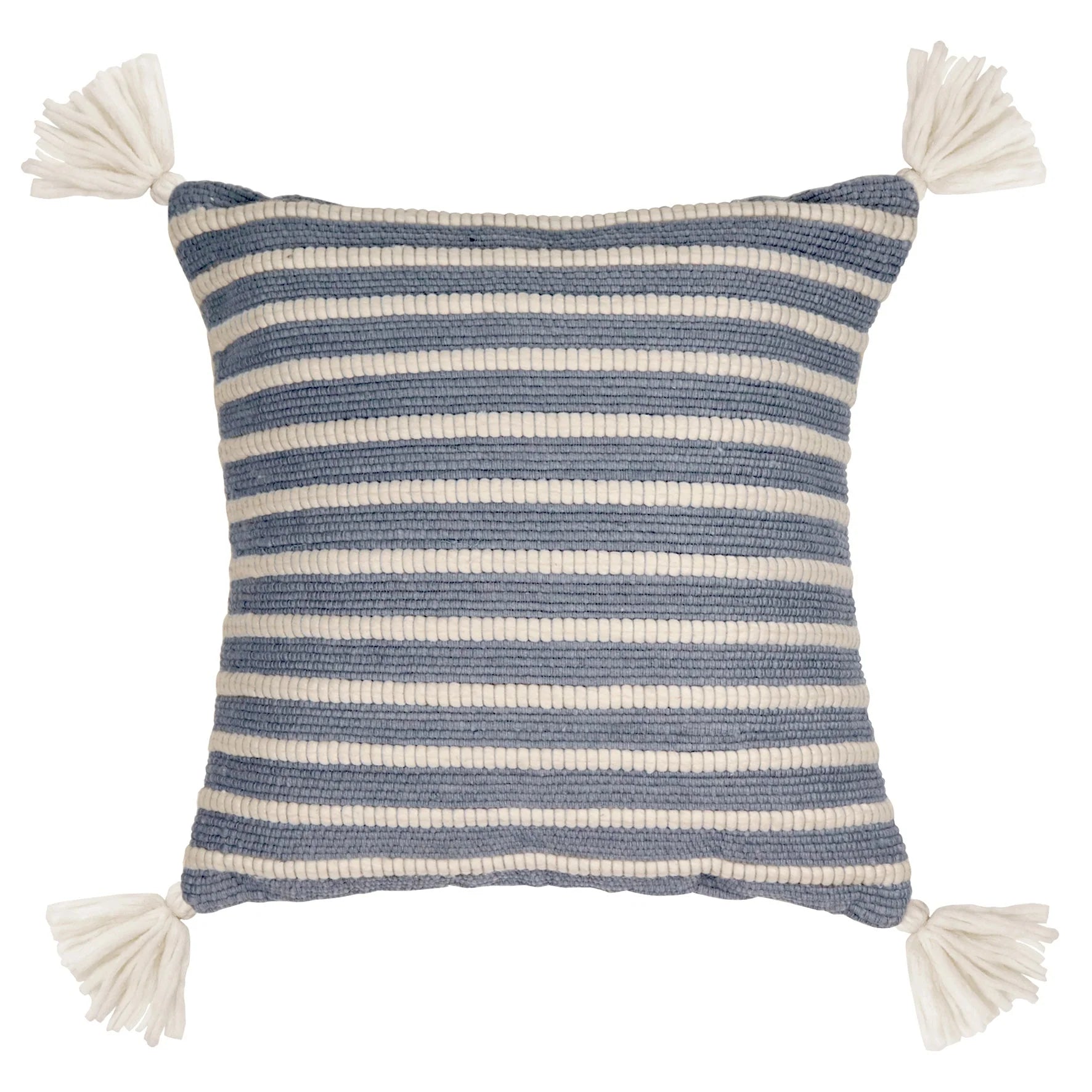 Featuring a ribbed stitching effect in an alternating blue and off-white stripe, with chunky off-white tassels, our Elwood Blue Tassel cushion brings softness to any space.