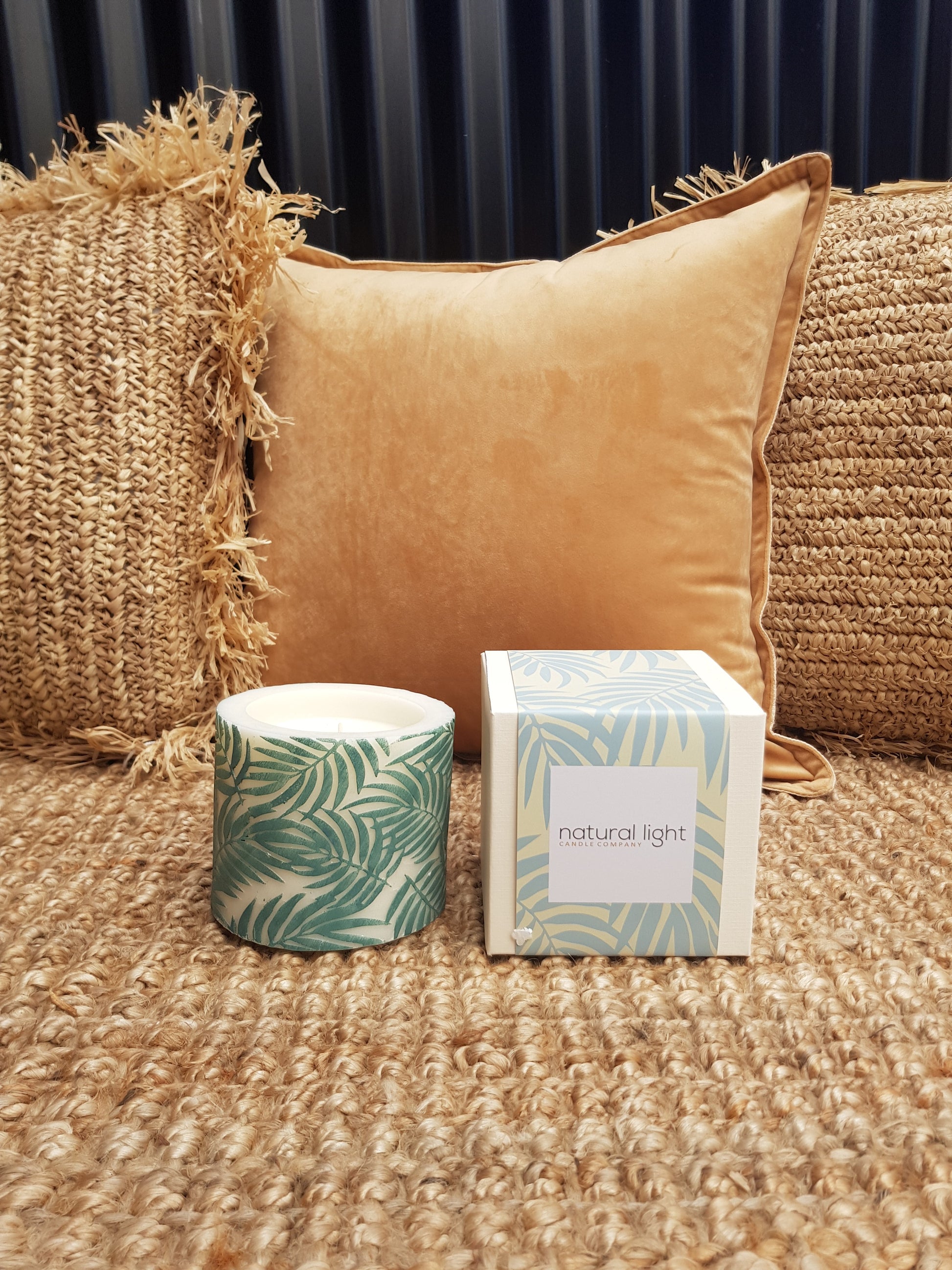 Palm Leaf 4" Pillar White/Bayberry